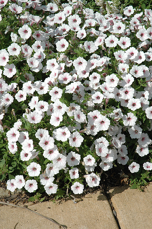 Supertunia Vista® Silverberry Petunia is smothered in stunning white trumpet-shaped flowers with pink veins at the ends of the stems from mid spring to mid fall. Its pointy leaves remain green in color throughout the season.