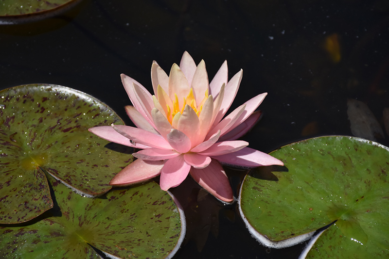 Elegant, peachy-pink star-shaped flowers with golden centers; deep green foliage with reddish spotted freckles; a beautiful addition to your pond; easy to care for; water lilies dislike moving water