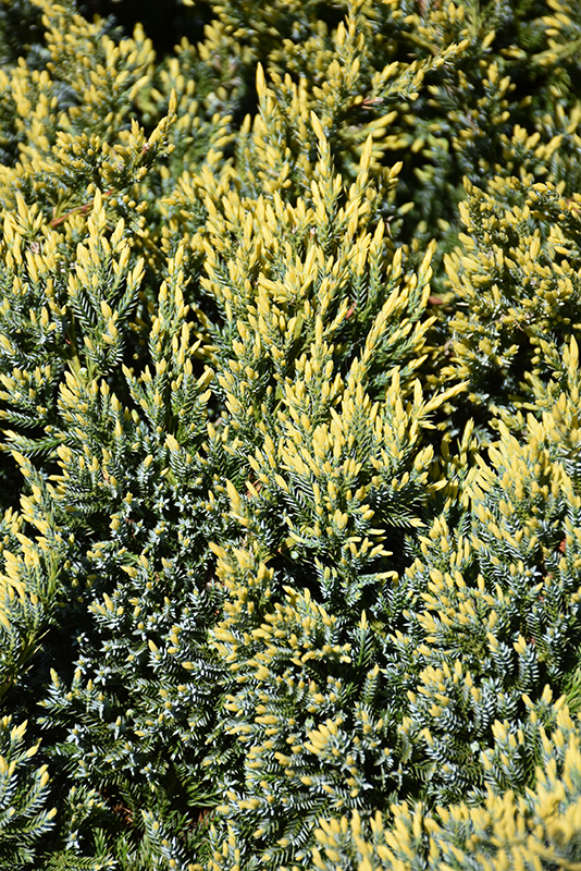 A most beautiful groundcover juniper, featuring bright yellow new growth over bluish-green fine-textured foliage; compact, mounded, with arching branch tips that spread out; superb for massing or as a color accent groundcover