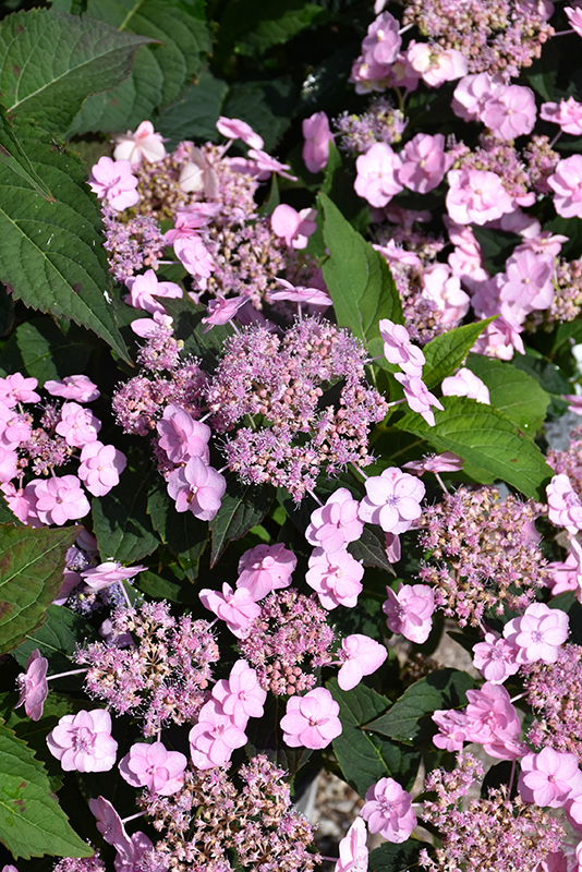 Tiny Tuff Stuff™ Hydrangea features bold pink lacecap flowers with white overtones and blue streaks at the ends of the branches from early to late summer. The flowers are excellent for cutting. It has attractive dark green deciduous foliage. The serrated pointy leaves are highly ornamental and turn an outstanding burgundy in the fall.