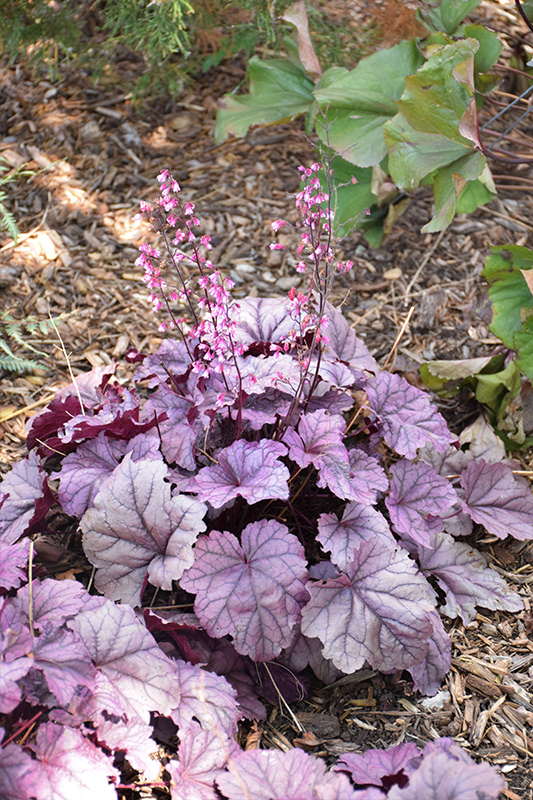 Pink Panther Coral Bells features dainty spikes of rose bell-shaped flowers with pink overtones rising above the foliage in mid summer. Its attractive crinkled lobed leaves emerge rose in spring, turning plum purple in color with distinctive dark gray veins and tinges of silver the rest of the year.