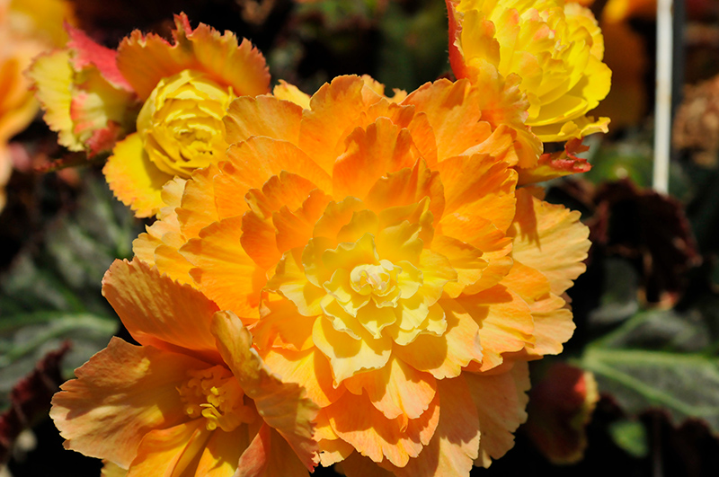 I'Conia® Portofino Citrix Begonia features bold double yellow frilly flowers with peach overtones at the ends of the stems from late spring to early fall. Its heart-shaped leaves remain dark green in color throughout the year.