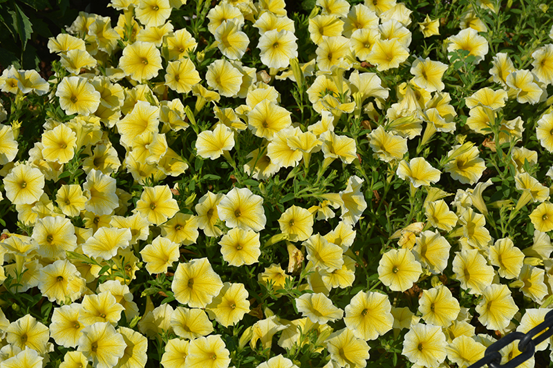 Bee's Knees Petunia is smothered in stunning buttery yellow trumpet-shaped flowers with yellow centers at the ends of the stems from mid spring to early fall. Its pointy leaves remain dark green in color throughout the season.