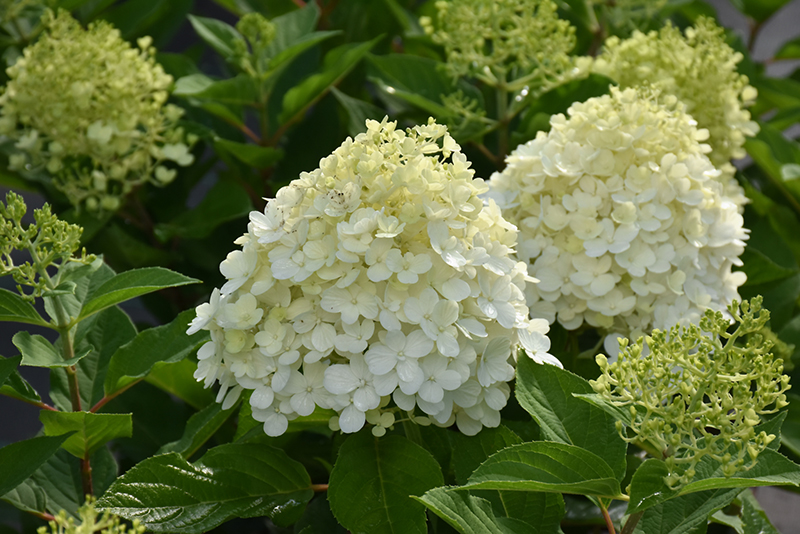 Fire Light Tidbit® Hydrangea features bold conical white flowers with pink overtones at the ends of the branches from mid summer to late fall. The flowers are excellent for cutting. It has green deciduous foliage. The pointy leaves do not develop any appreciable fall color.