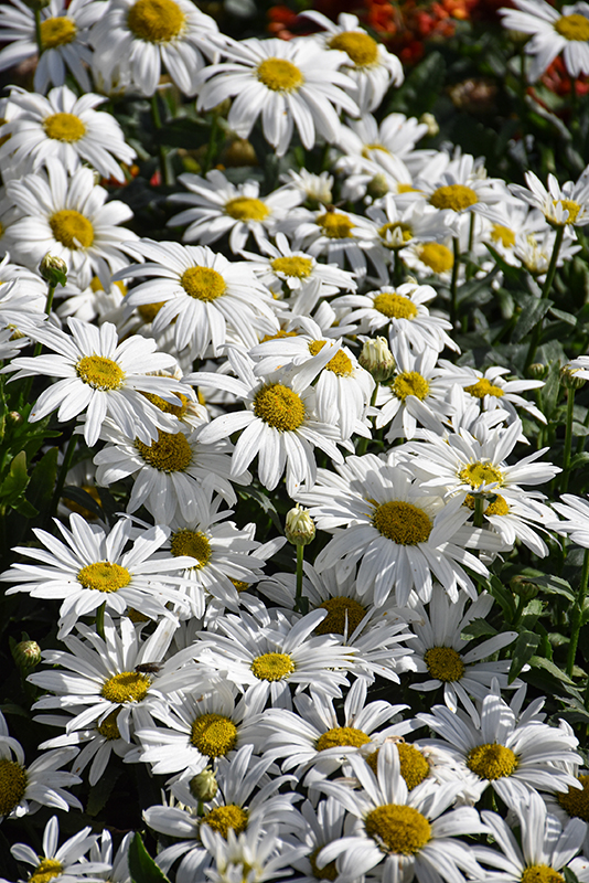 A beautiful, robust Shasta daisy featuring dense white blooms with feathery petals around their golden centers; well branched, with a tidy, sturdy habit; a beautiful addition to the garden when massed; hardy and blooms throughout the summer