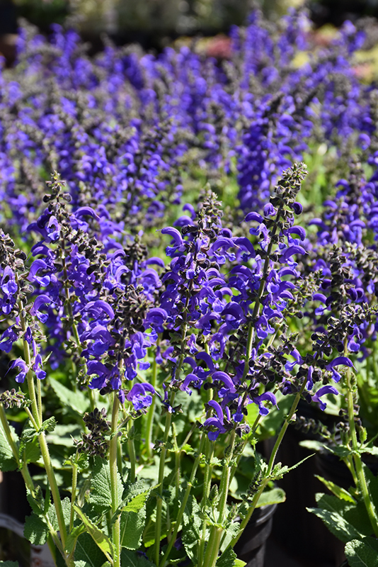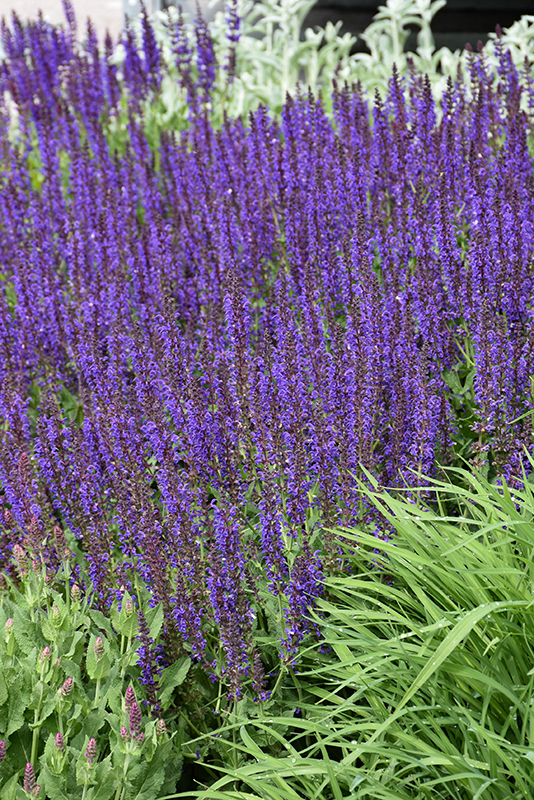 Fashionista® Evening Attire Sage has masses of beautiful racemes of fragrant violet tubular flowers with blue overtones and deep purple calyces rising above the foliage in early summer, which are most effective when planted in groupings. The flowers are excellent for cutting. Its tomentose narrow leaves remain green in color throughout the year.
