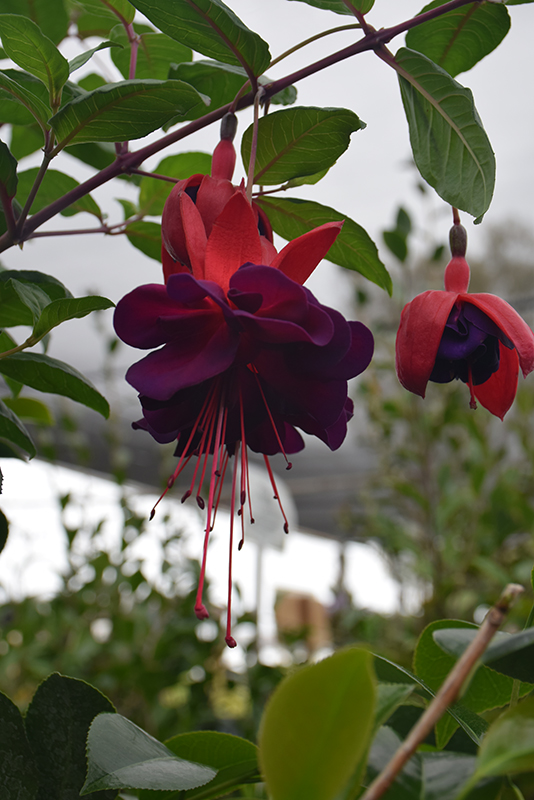 Voodoo Fuchsia features dainty nodding double purple frilly flowers with royal blue overtones and hot pink calyces at the ends of the branches from early summer to mid fall, which emerge from distinctive coral-pink flower buds. Its pointy leaves remain green in color throughout the year.