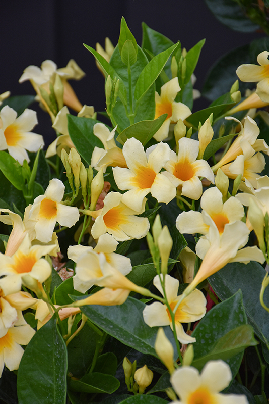 Calypso Limone Mandevilla features bold yellow tubular flowers with gold throats along the branches from late spring to mid fall. Its glossy pointy leaves remain dark green in color throughout the year.