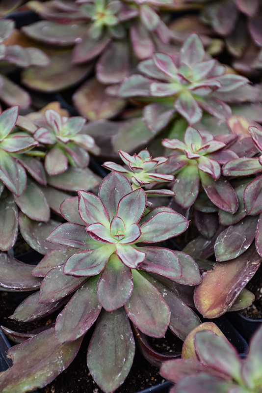 This variety produces rosettes of spoon shaped foliage that is olive green, with vivid red variegation that turns burgundy in full sun; foliage features unusual nodules on surface; rose-red flowers in spring; ideal for patio containers or rock gardens