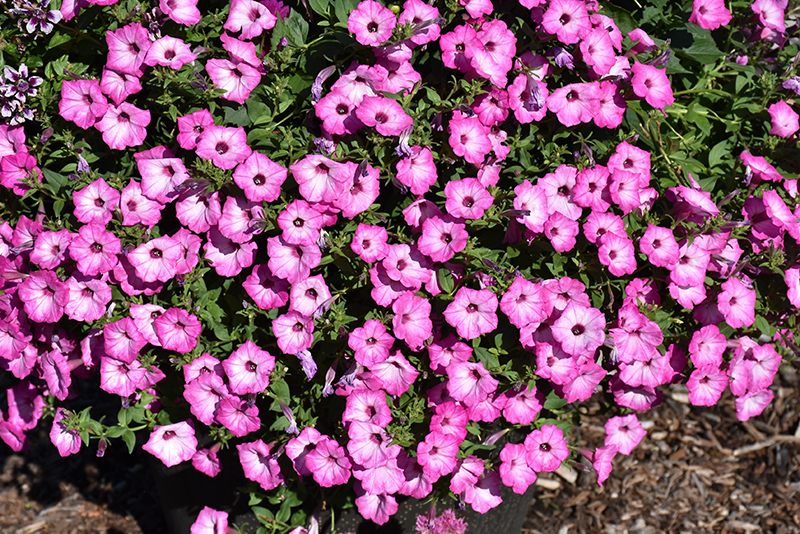 This fast growing, long bloomer adds the perfect pop of color to any hanging basket, patio container or sunny gardens; large pink blooms with plum-purple veins stand out again green foliage; mounded habit with trailing tendencies; heat tolerant