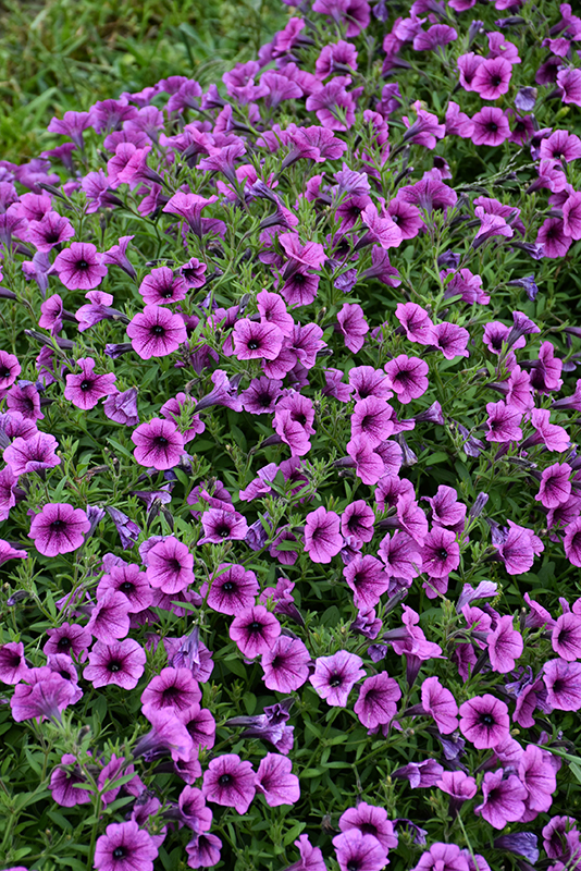 Supertunia Mini Vista® Plum Veined Petunia is covered in stunning pink trumpet-shaped flowers with plum purple veins at the ends of the stems from mid spring to mid fall. Its pointy leaves remain green in color throughout the season.